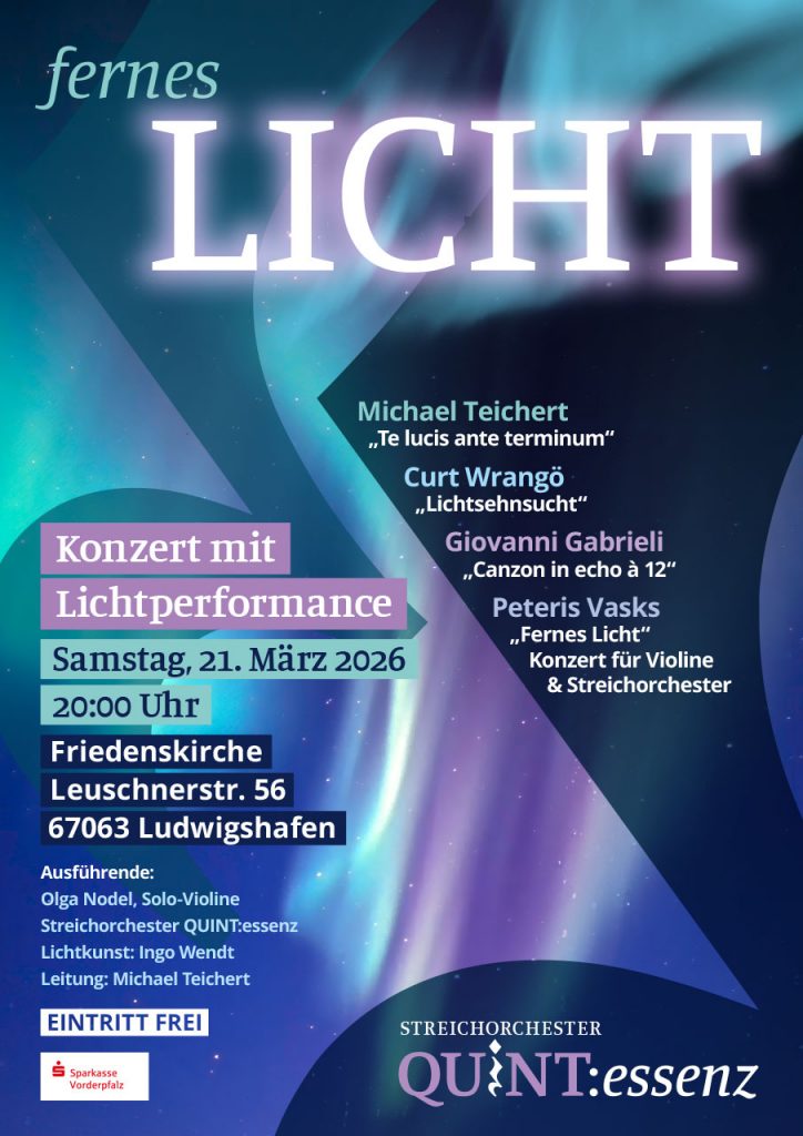 Mit Werken von Michael Teichert: „Te lucis ante terminum“, Curt Wrangö: „Lichtsehnsucht“, Giovanni Gabrieli: „Canzon in echo à 12“ und Peteris Vasks: „Fernes Licht“. Ausführende: Olga Nodel, Solo-Violine; Streichorchester QUINT:essenz; Lichtkunst: Ingo Wendt; Leitung: Michael Teichert.